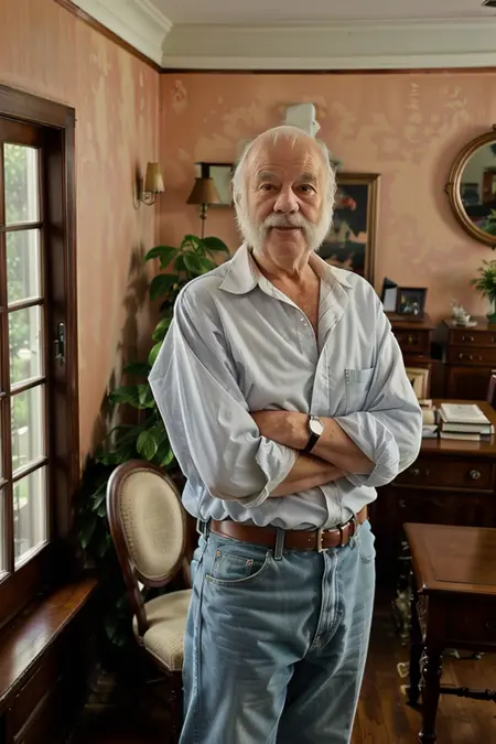 • {30세 마른 남자, 긴 두꺼운 콧수염, 수염 없음, 깎은 턱 | 50세 평범한 남자, 긴 두꺼운 콧수염, 깎은 턱, 회색 머리 | 70세 통통한 남자, 긴 두꺼운 콧수염, 깎은 턱, 흰 머리}가 흰색 오래된 스타일의 셔츠를 입고, 오래된 저택의 방에서, 창백한 피부, 명작, 행복한 표정, (미디엄 샷), 매우 상세, HDR, 4K, 니콘 k850