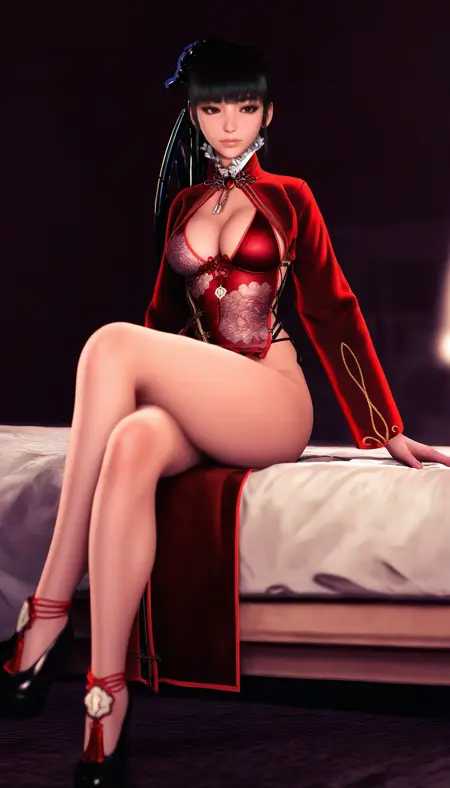 black hair,bangs,long ponytail,mechanical hair ornament,brown eyes,red qipao,