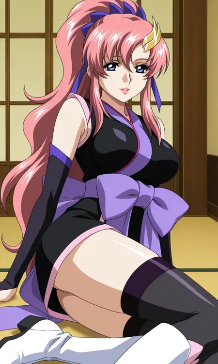 lacus_clyne, 1girl, anime coloring, solo, long hair, very long hair, ponytail, pink hair, hair between eyes, hair ornament, playboy hair ribbon, red ribbon, blue eyes, breasts, large breasts, Thighs, hairclip,