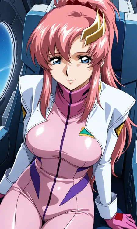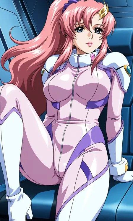 lacus pilot suit, pink white bodysuit, pilot gloves, shoulder armor, pilot boots, high heels,
