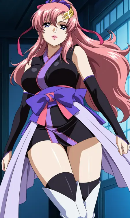 Lacus Clyne, 1girl, anime coloring, solo, pink hair, blue eyes, breasts, médium breasts, Thighs, long hair, hair ornament, very long hair, hair bow, ponytail, floating hair, hair between eyes, hairclip,