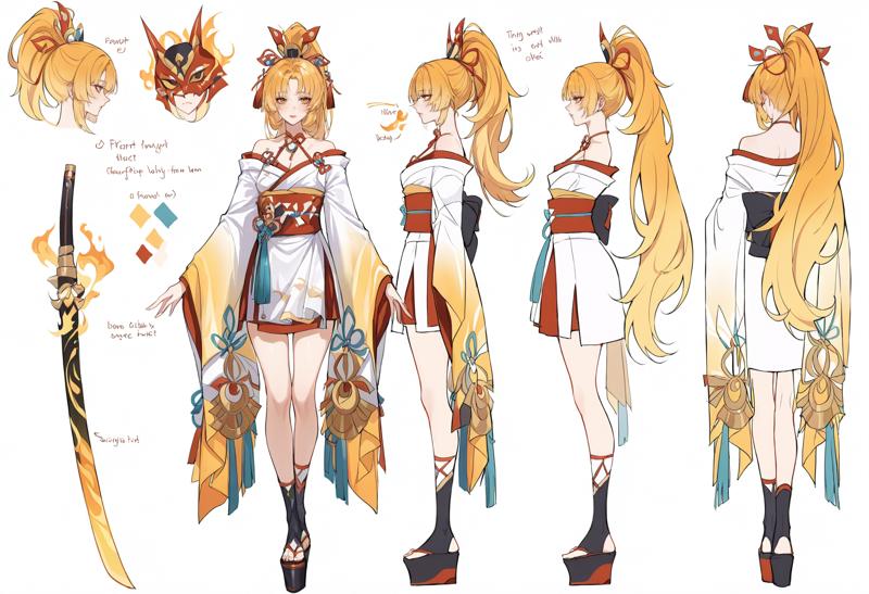 Dragonfly Reverie Skin: 1girl,black eyes,yellow eyes,two-tone eyes,multicolored eyes,orange eyes,blonde hair,orange hair,long hair,ponytail,bangs,hair ornament,mask,off shoulder,bare shoulders,shawl,japanese clothes,wide sleeves,sash,kimono,white kimono,long sleeves,obi,tassel,skirt,socks,platform footwear,geta,sheath,toeless legwear,jewelry,sandals