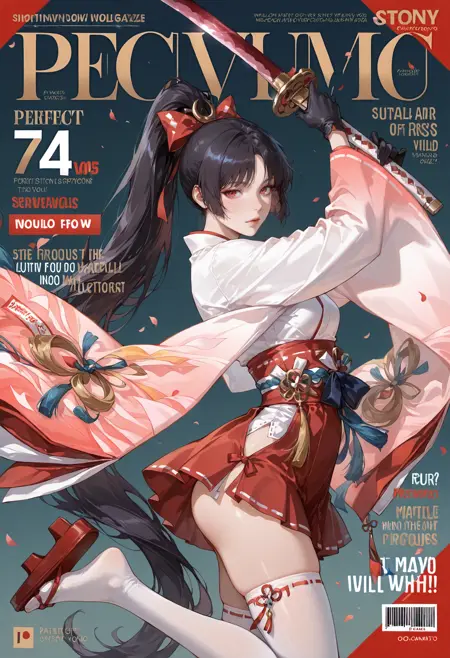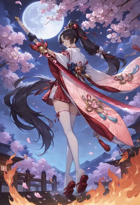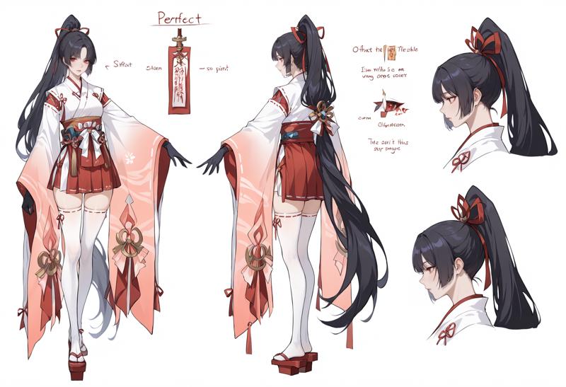 Ceremonial Blade Skin: 1girl,red eyes,bangs,black hair,ponytail,long hair,very long hair,bow,hair bow,ribbon,hair ribbon,gloves,black gloves,japanese clothes,kimono,long sleeves,wide sleeves,skirt,red skirt,hakama,thighhighs,white thighhighs,sandals,geta,miko,sheath,ofuda