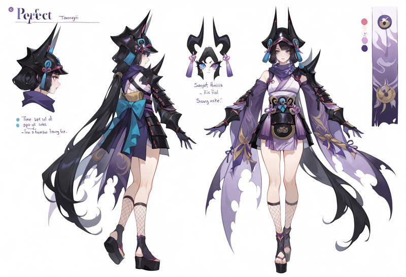 Evolved Skin: 1girl,blue eye,purple eye,asymmetrical eyes,multicolored eyes,bangs,black hair,long hair,short hair,very long hair,helmet,fake horns on helmet,black horns,animal ears,scarf,torn scarf,purple scarf,gloves,gauntlets,kote,armor,japanese armor,shoulder armor,chinese clothes,tangzhuang,kimono,short kimono,purple kimono,long sleeves,sode,platform footwear,fishnets,fishnet socks,sandals,toeless footwear