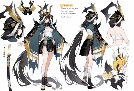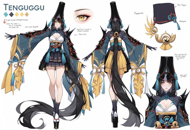 Draft Skin: 1girl,very long hair,yellow eyes,black hair,long hair,absurdly long hair,bangs,hat,black headwear,breasts,medium breasts,cleavage,gloves,armor,shoulder armor,japanese armor,tassel,japanese clothes,kimono,long sleeves,wide sleeves,sash,obi,skirt,pleated skirt,socks,sandals,platform footwear,geta,tabi,tengu-geta