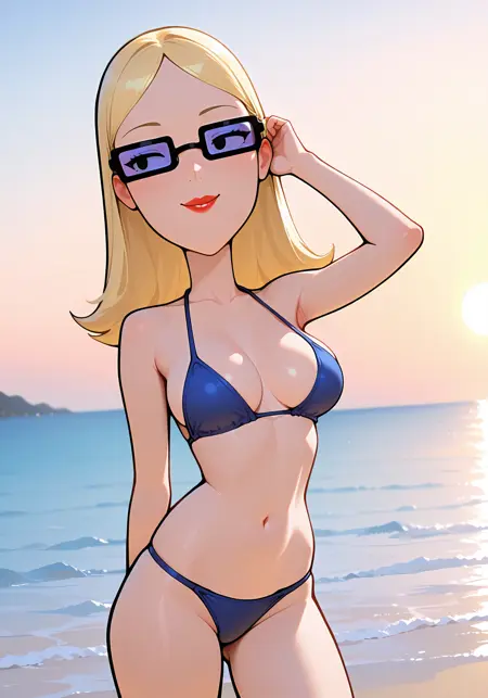 blonde hair, black eyes, red lips, lipstick, glasses, tinted lenses