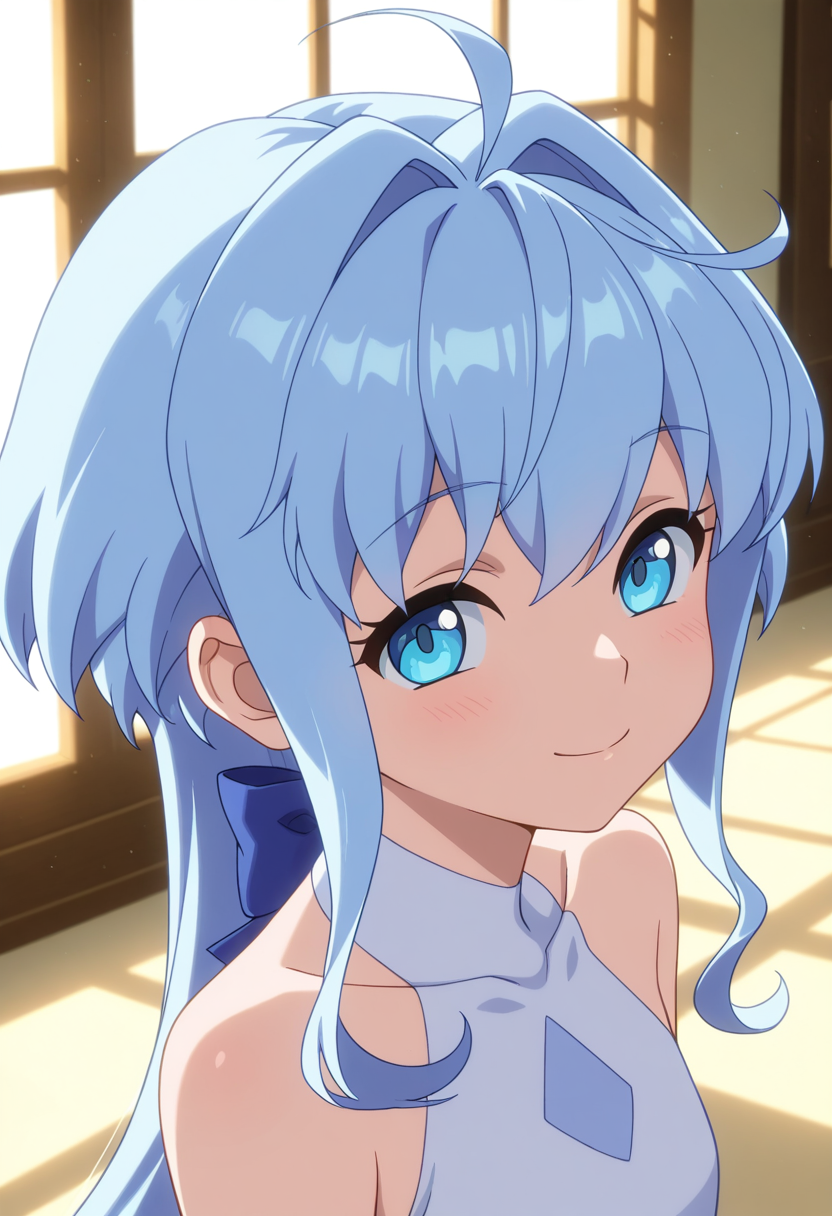 - saraww, blue eyes, blue hair, long hair, very long hair, hair intakes, sidelocks, ahoge,