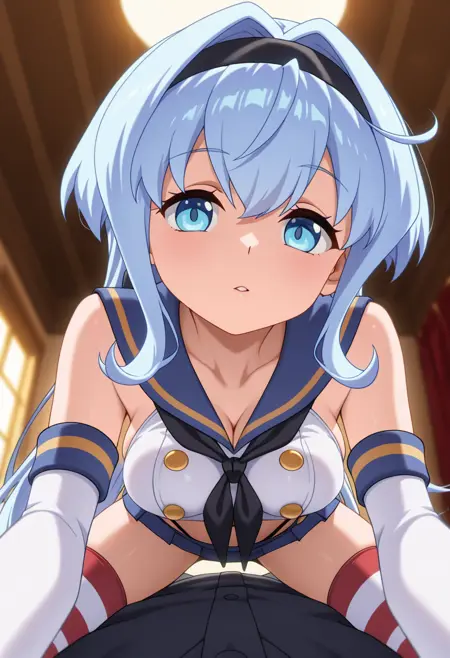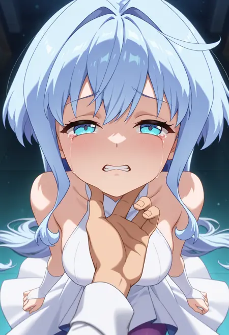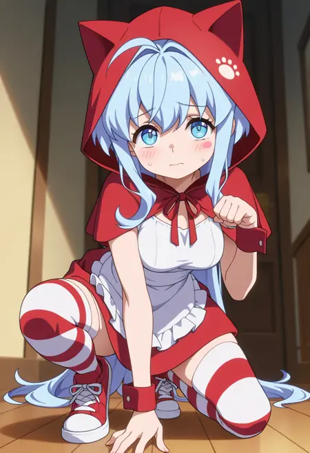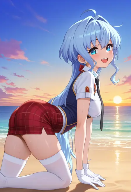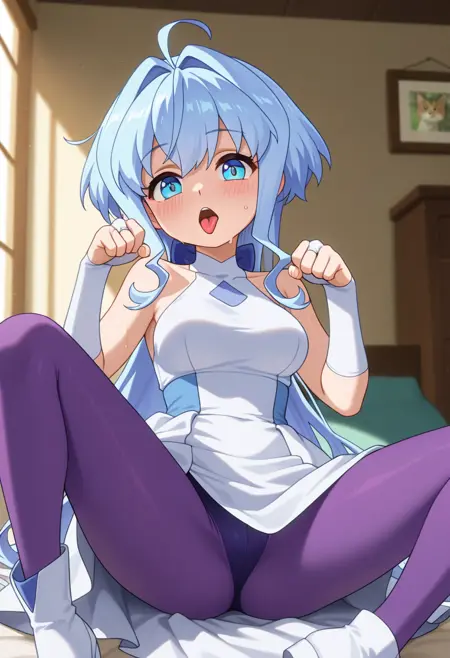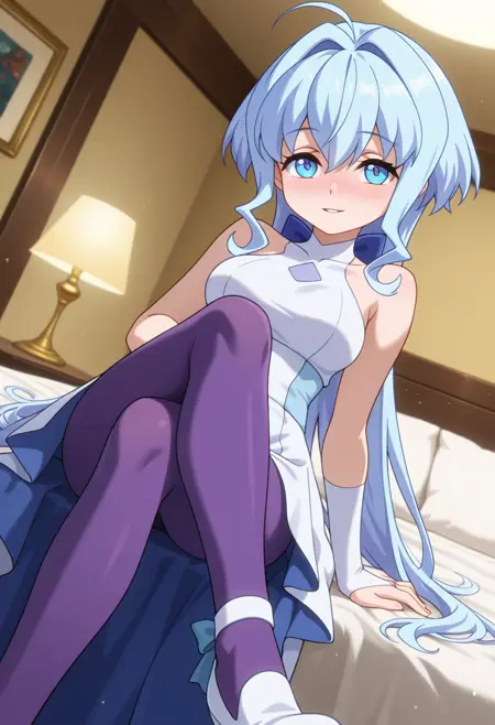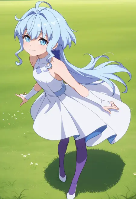 - white high-low dress, sleeveless, blue bow, white bridal gauntlets, purple pantyhose, white footwear,