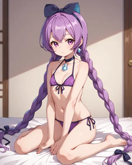 미미코, 보라색 머리카락, 보라색 눈, 땋은 머리, 쌍둥이 땋은 머리, 긴 머리, 매우 긴 머리, 1소녀, 단독, 보라색 비키니, 가슴 노출, 사이드 타이 비키니 하의, 리본, 전신