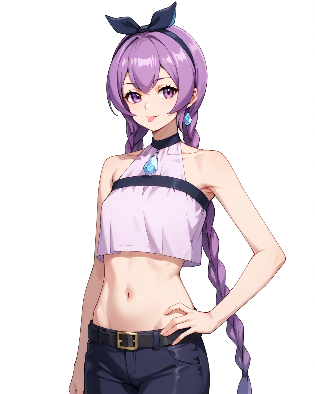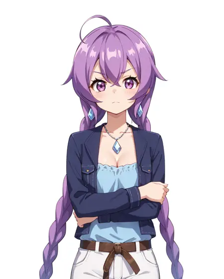 미미코, 보라색 머리카락, 보라색 눈, 땋은 머리, 쌍둥이 땋은 머리, 긴 머리, 매우 긴 머리, 1소녀, 단독, 귀걸이, 장신구, 어깨 노출