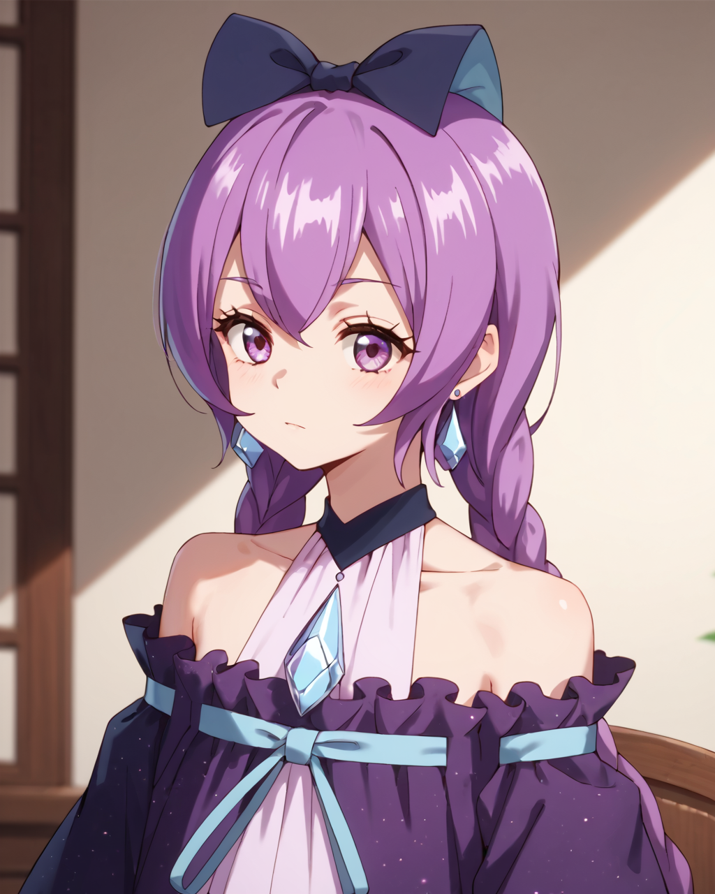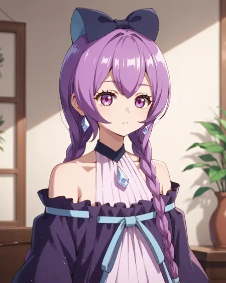 미미코, 보라색 머리카락, 보라색 눈, 땋은 머리, 쌍둥이 땋은 머리, 긴 머리, 매우 긴 머리, 1소녀, 단독, 장신구, 미소, 귀걸이, 드레스, 실내, 머리 리본, 리본, 꽃, 그림 \(객체\), 어깨 노출, 화병, 보라색 드레스, 초커, 어깨 드리우기