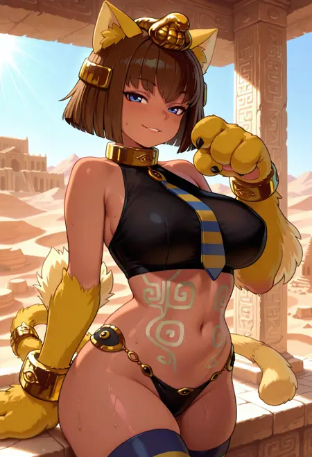 egyptian, striped thighhighs, black bikini bottom, black crop top, horizontal-striped necktie, blue and yellow stripes, hair ornament, uraeus, gold collar, gold bracelet, gold jewelry, tail ornament, stomach tattoo, bare shoulders, navel, midriff