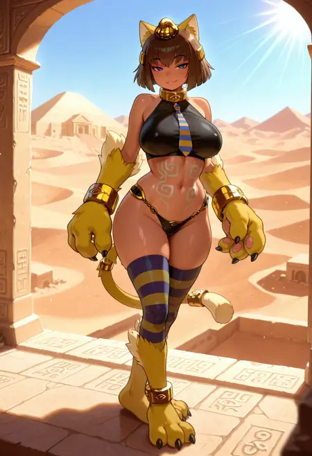 sphinxmge, cat girl, monster girl, animal hands, animal arms, animal feet, cat ears, cat tail, fewer digits, black claws, yellow fur