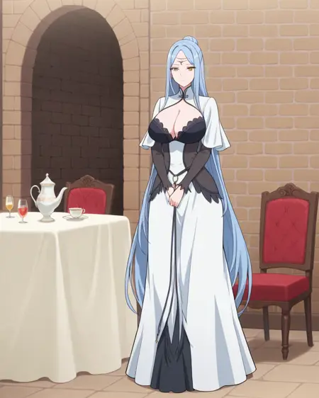 Ophilia,浅蓝色头发,黄绿色眼睛,胸部,长发,非常长的头发,大胸,1个女孩,单人,露胸,裙子,头环,发髻,桌子,露胸剪裁,服装剪裁,单个发髻,椅子,砖墙,短披肩,全身