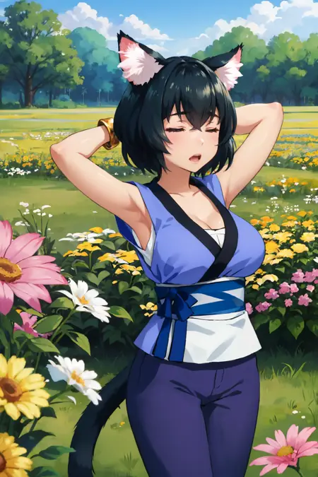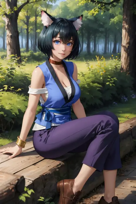 Add "purple shirt, sleeveless, sash, purple pants" for her typical look.