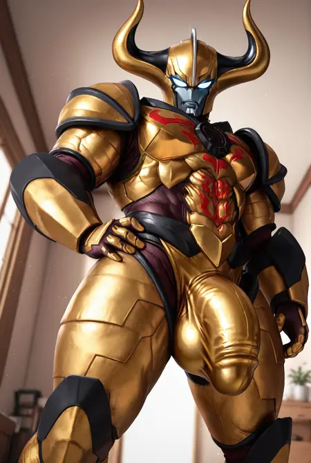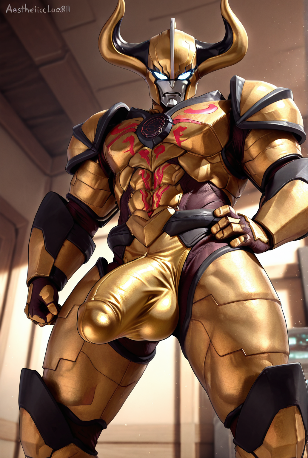 トリガー単語: abs0lute diav0l0, alien, horns, helmet, gold armor, armor, full armor, glowing eyes, blue eyes