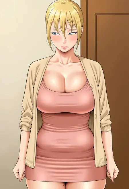 - 美佳(1girl、ショートヘア、金髪、青目、大きな胸、片方の髪の結び目、成熟した女性)