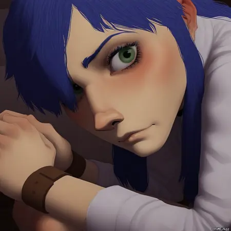 强化标签:人类鼻子、蓝发、白衬衫、绿眼、女性