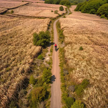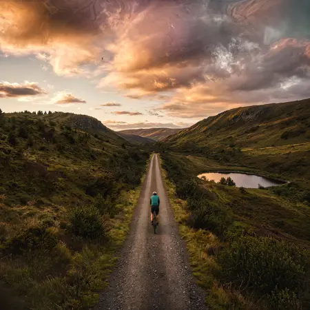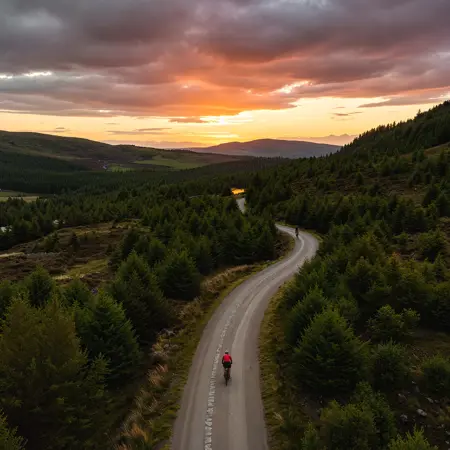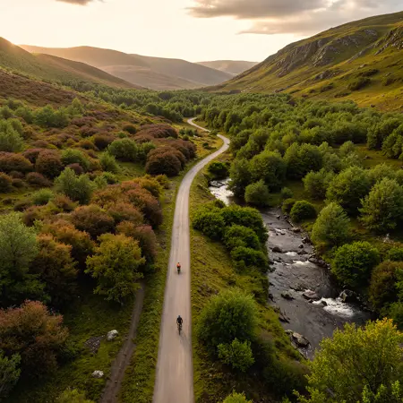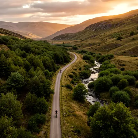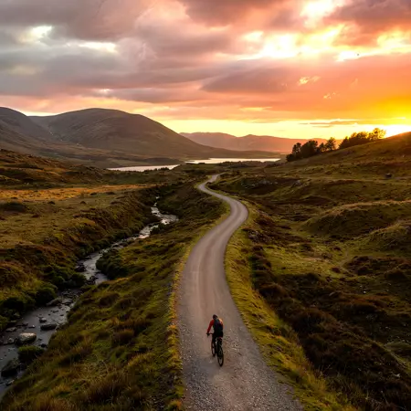 一名男子在苏格兰高地的碎石路上骑行,背景是美丽的风景和写实的摄影。他骑行穿越群山,沉浸在自然环境中。镜头由空中无人机拍摄,从高处跟随他的身影。