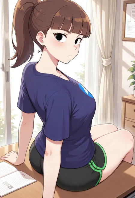 1girl, solo, brown hair, ponytail, blunt bangs, black eyes, collarbone, medium breasts