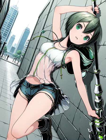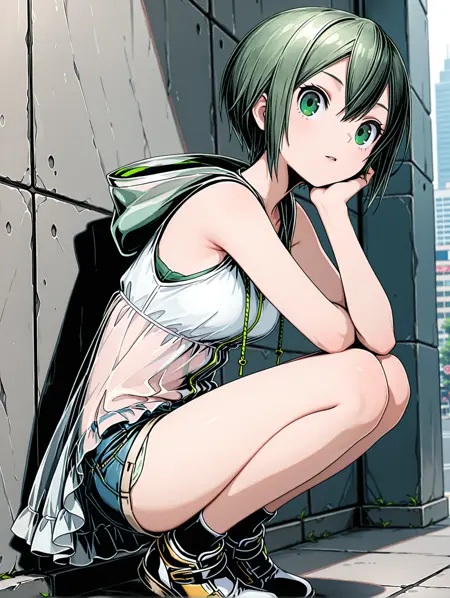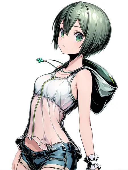 衣装 ・m_clothes,hood down,white tank top,see-through dress,wrist cuffs,denim shorts,socks,shoes,