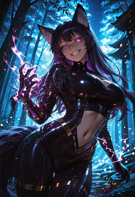 기본 복장: 검은 바디수트, 전체 바디수트, 보라색 보석, 금장식, 털장식, 검은 하이레그, 검은 장갑, 옷 절개부, 배꼽, 가슴 절개부, 등 절개부, 크롭탑