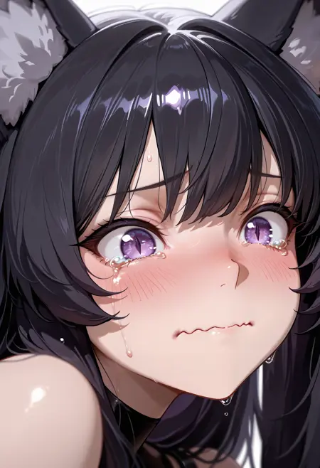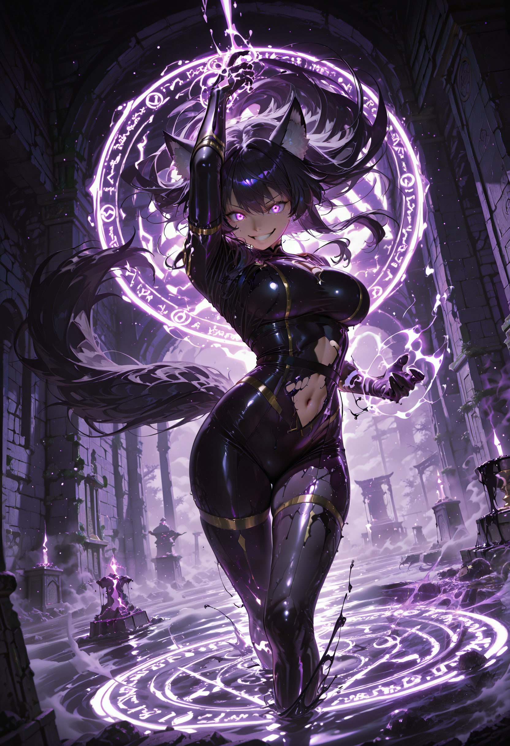 외모 태그: delta (em_shadow), 1girl, 얼굴 문신, 보라색 얼굴 문신, 동물 귀, 늑대 귀, 동물 귀 털, 늑대 꼬리, 긴 검은 머리, 보라색 눈, 큰 가슴, 날카로운 이빨