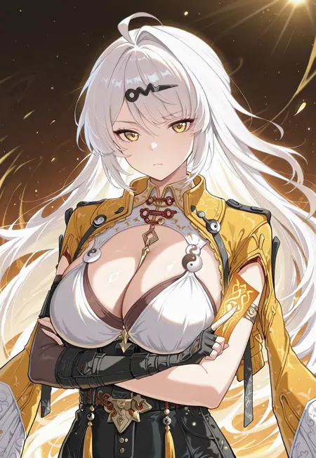 yixuanzzzxl1111 illustrious, yixuan, white hair, ahoge, long hair, yellow eyes, hairclip,