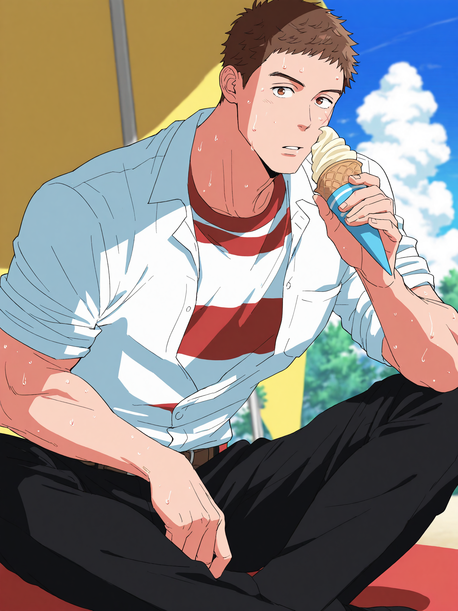 赤と白の縞模様のTシャツ、白シャツ、カラー付きシャツ、袖をまくった、黒パンツ、ベルト、