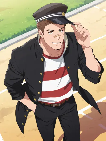 赤と白の縞模様のTシャツ、学校制服、学ラン、黒パンツ、ベルト、黒帽子、鼻に絆創膏、開いた服、