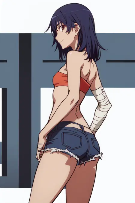 ショートパンツ、へそ、腹筋露出、肩を露出、ストラップレス、包帯を巻いた腕