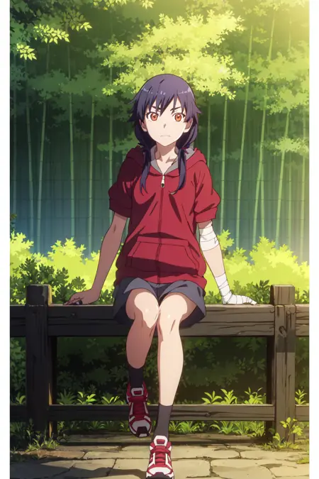 フード付きパーカー、包帯を巻いた腕、ジャケット、ショートパンツ、フードを下げた状態、短めの袖、ジッパー、髪のリボン