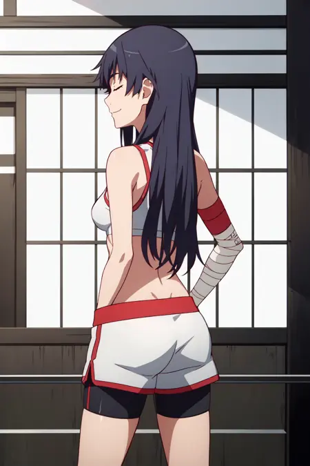 靴、スニーカー、自転車用ショートパンツ、包帯を巻いた腕、肩を露出、スポーツウェア