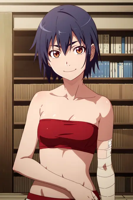 短裤、肚脐、露腹、裸露的肩膀、无吊带、缠绷带的手臂