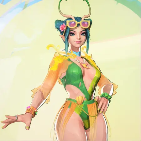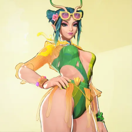 swimmantis, short hair, 3d, green one-piece swimsuit, antennae, double bun, green nails, anklet, nail polish, hair ornament, bracelet, sunglasses, choker, makeup