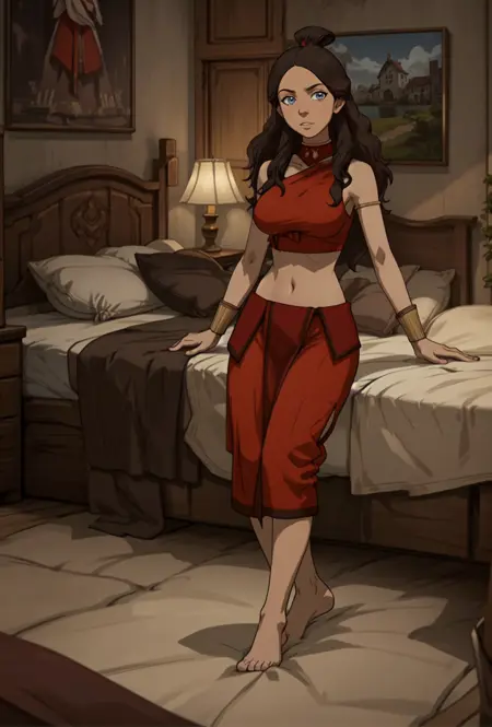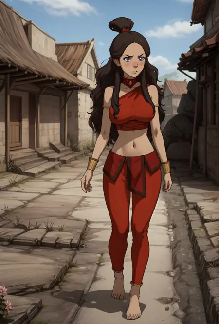 ✦ 主要触发词为:蓝眼睛、红衣服、棕色头发、露脐上衣、发饰、发髻,