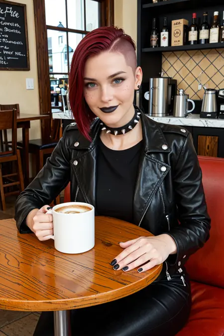 Trigger Normal after : VanessaKapatelis,, short hair, undercut, red hair, blue eyes, freckles, black lips, spiked collar, leather jacket, black shirt