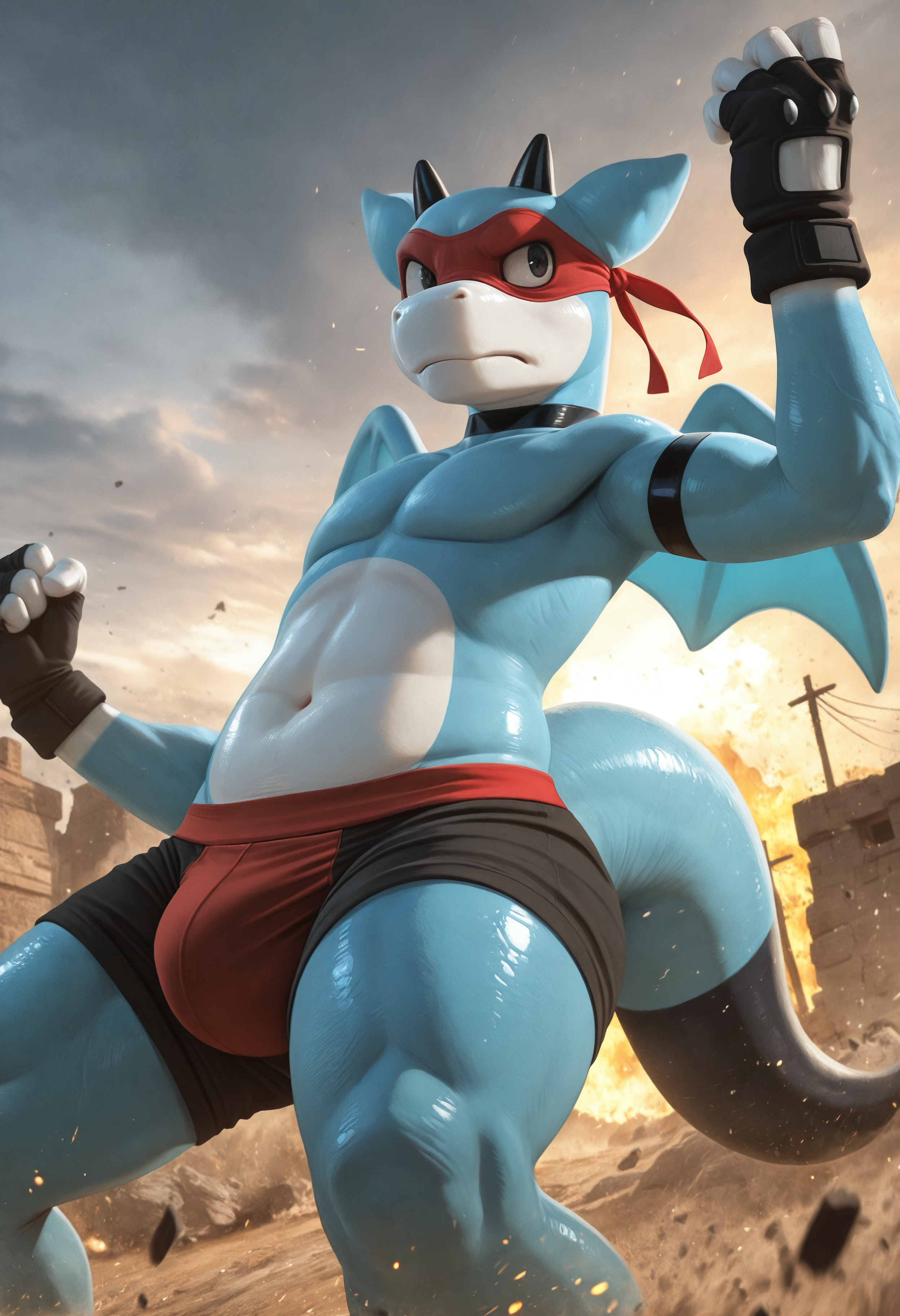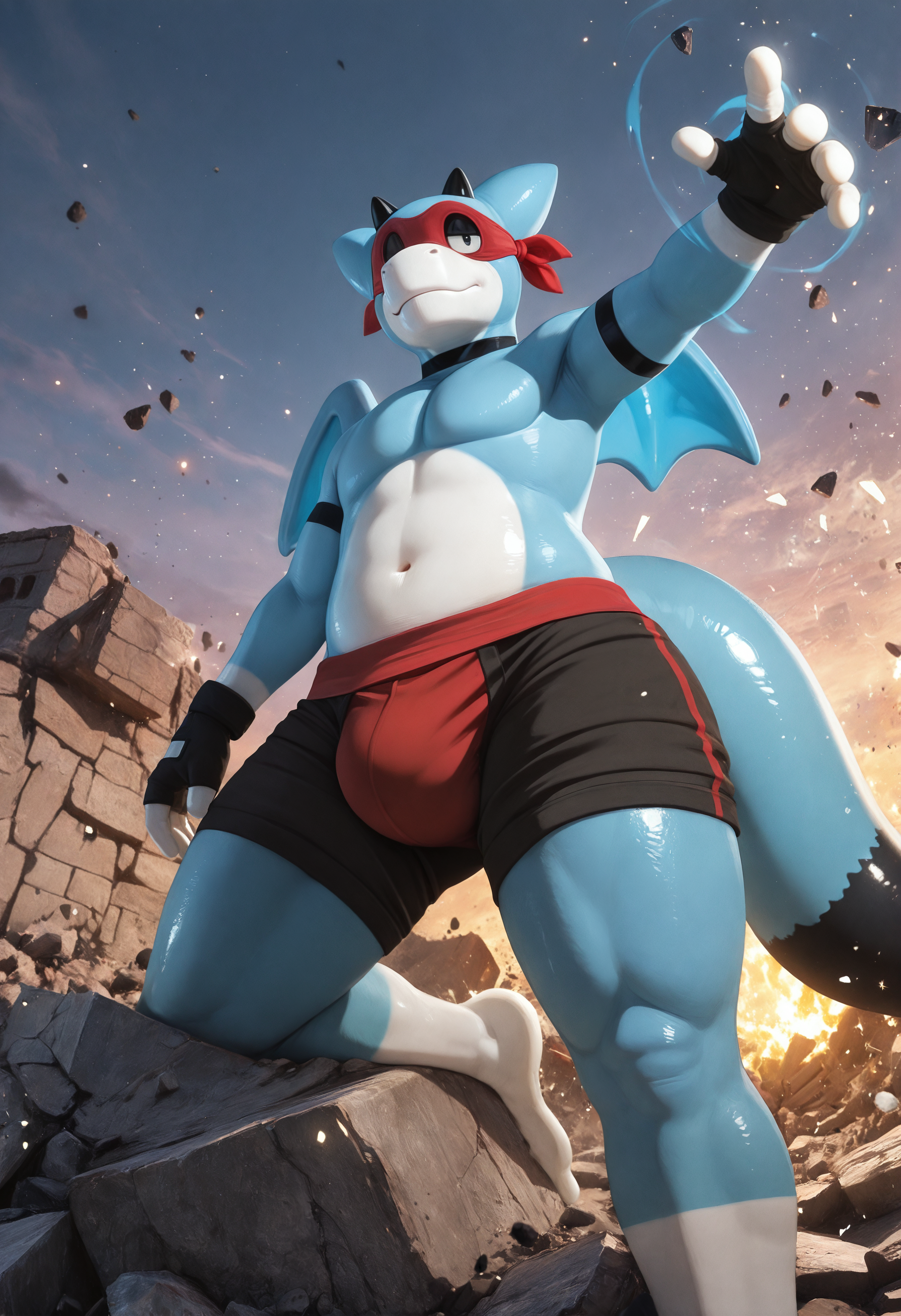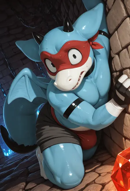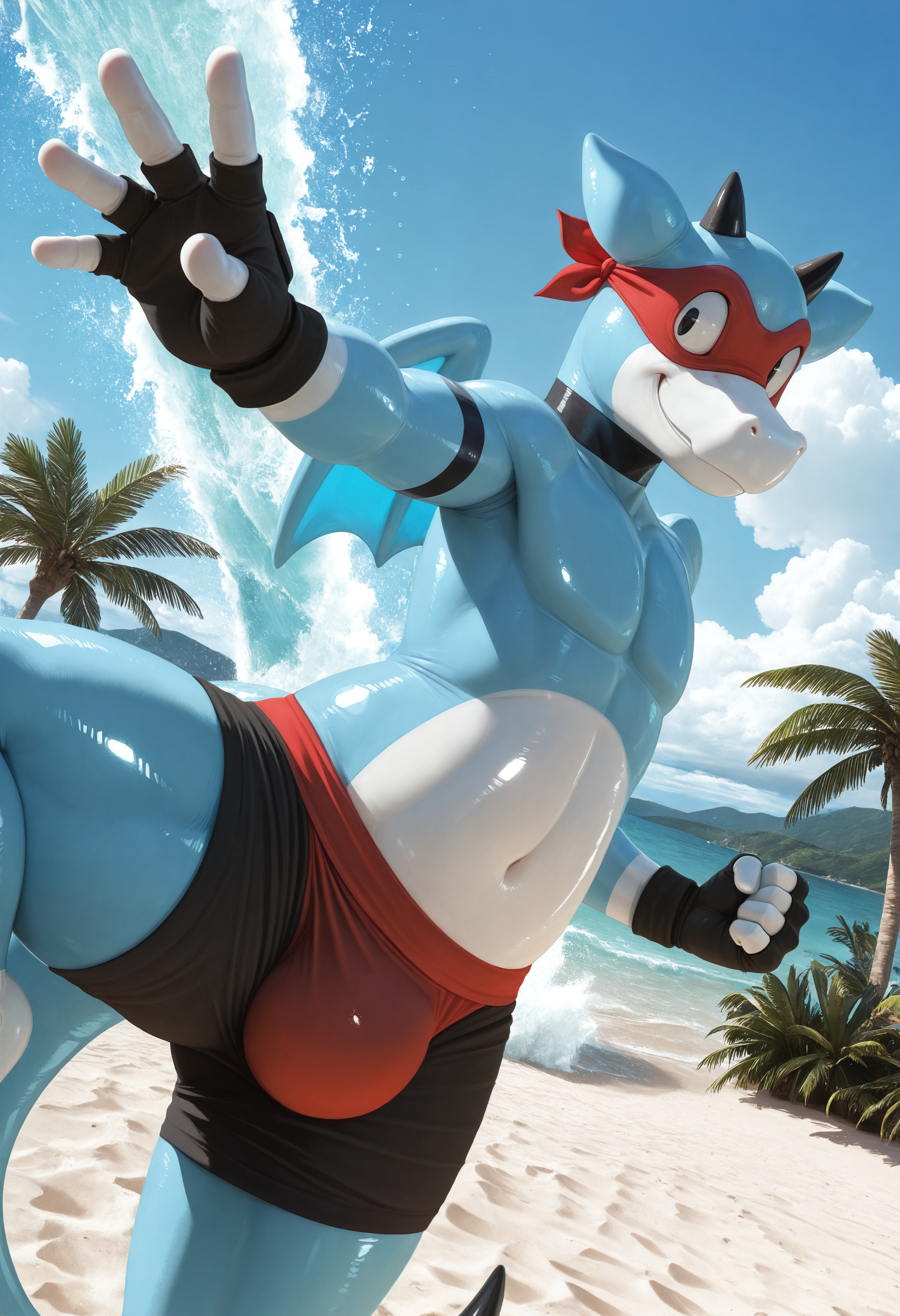 j0e_0h_s0_her0, dragon, black markings, mask, male focus, furry male, furry, black fingerless gloves, wings, tail, dipstick tail, 1boy, thick, thighs, solo, smooth body, shiny skin, blue skin, black boxers shorts, red underwear, white fingers