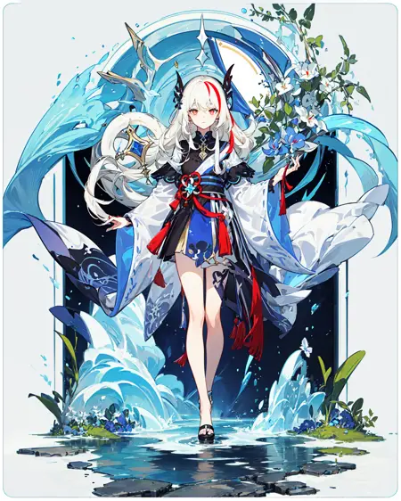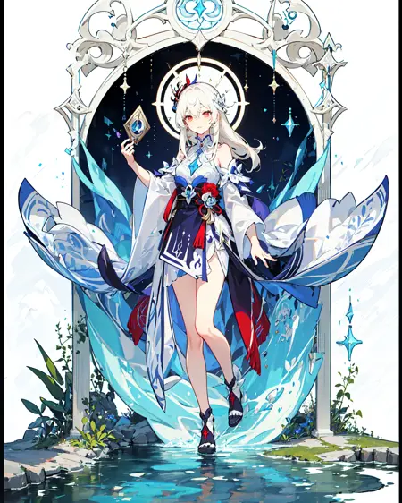 你可能会注意到,我的示例图像中包含大量 out border 以及塔罗牌风格的元素,这得益于两个 lora:第一个是训练好的 gsr,它使角色的装饰更加复杂华丽,同时在场景中增添相关道具;