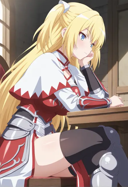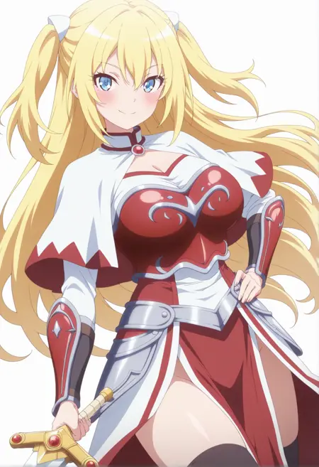 アーマードレス、赤い胸当て、カペレット、骨盤カーテン、ブラックの thighhighs、腕ガード、白いパンツ、すね当て