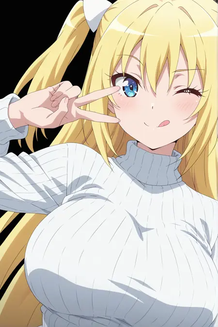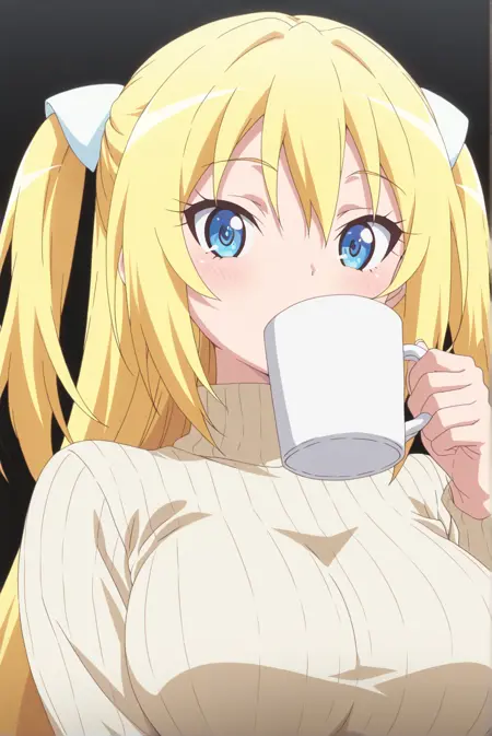 Appearance: luviliasochimono, large breasts, blue eyes, blonde hair, two side up, long hair