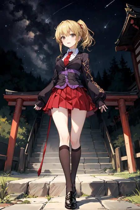カジュアル衣装: ツートーンスカート、バイカラー スカート、赤いスカート、ushiromiyaロゴ、ニーソックス、ジャケット、ネクタイ、紫のステッチ