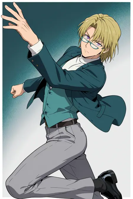 MrStewartSX, 1boy, blonde medium-length hair, thin rectangular blue glasses, teal blazer, light teal buttoned vest, white high-collar shirt, gray pants, black shoes, light purple eyes