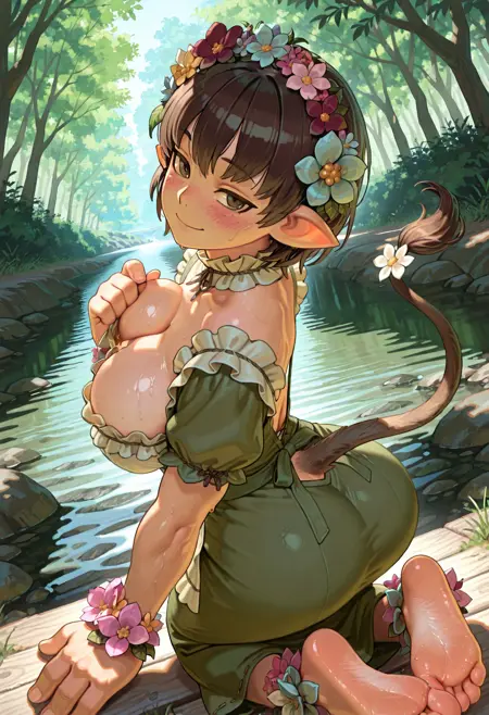 green dress, apron, frilled collar, flower ornaments, ankle flowers, wrist flowers, head wreath, tail flower, barefoot