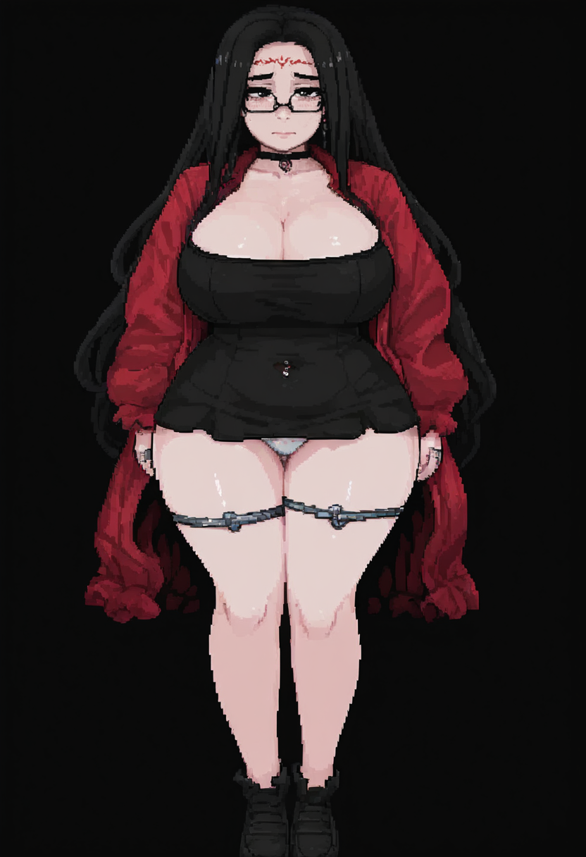 샘플 프롬프트: seri, 이마 마크, 마법 기호, 안경, 손 마크, 검은 머리, 매우 긴 머리, 목걸이, 허벅지 스트랩, 검은 목걸이, 검은 눈
