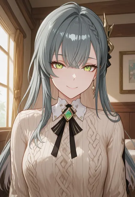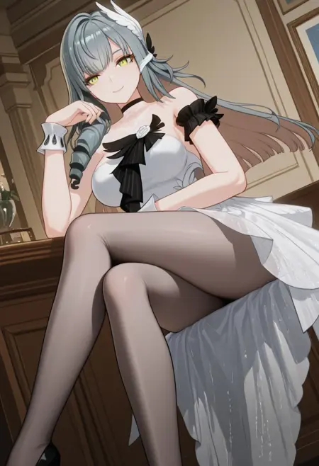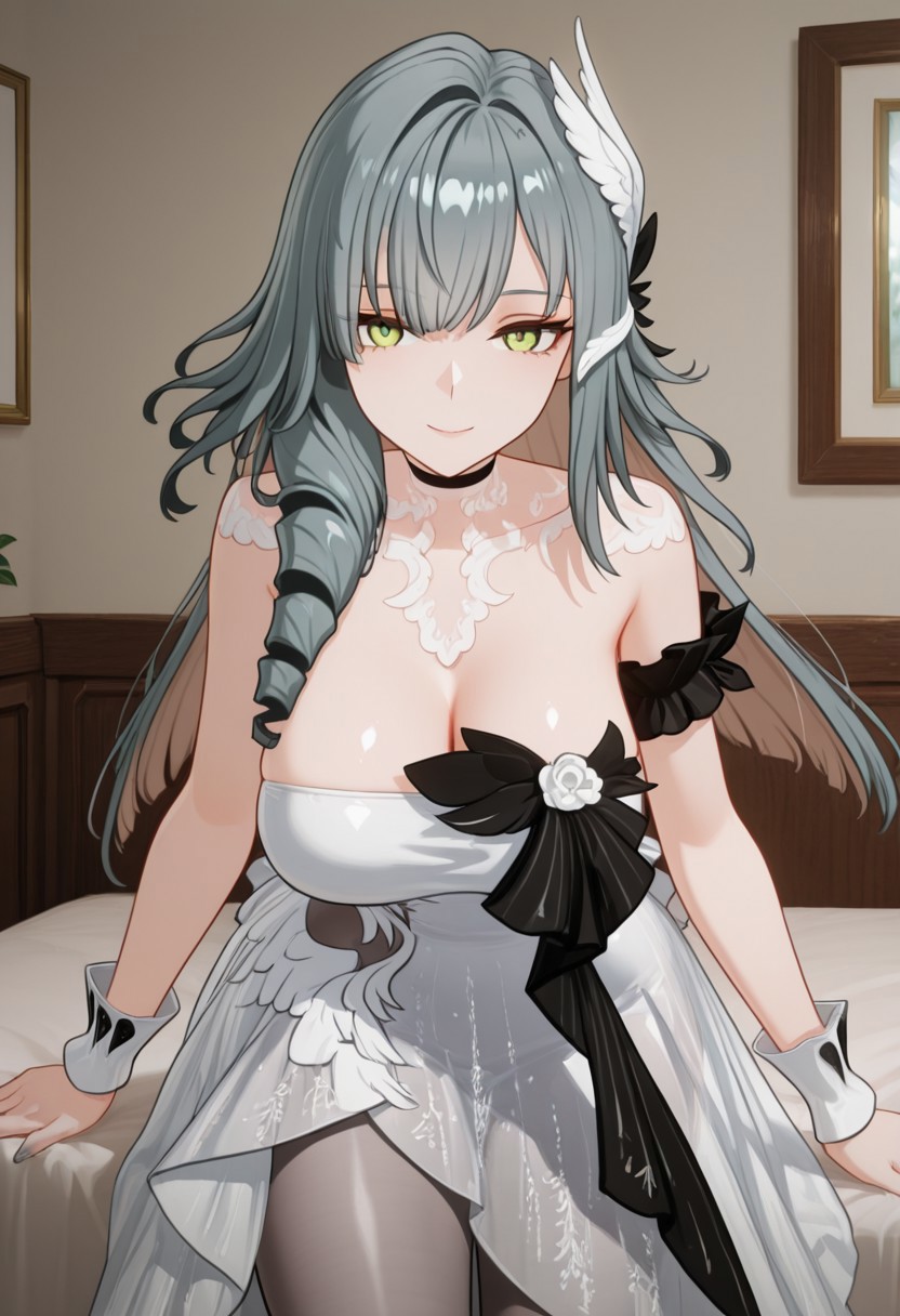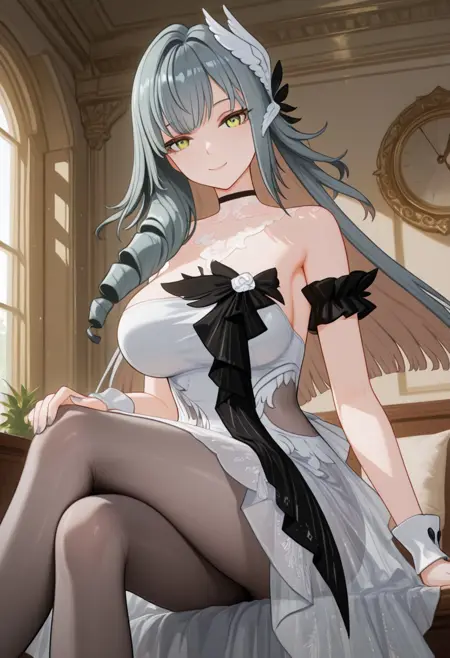 Thoth AG,暮诗,绿眼睛,灰发,长发,钻孔发型,钻孔侧发辫,发饰,羽翼发饰,项圈,蕾丝边项圈,白色项圈,大胸,连衣裙,白裙,无袖连衣裙,透视连衣裙,侧开衩,黑色蝴蝶结,连体丝袜,臂环,腕环,灰指甲