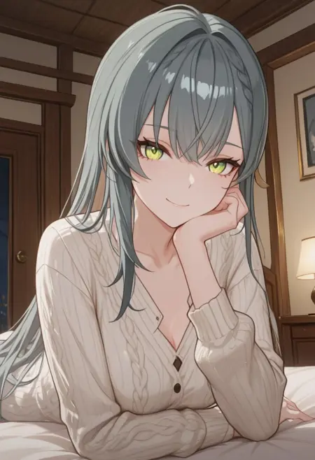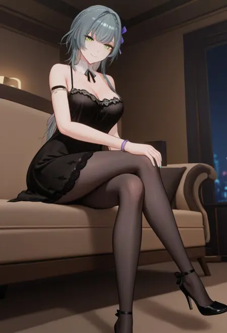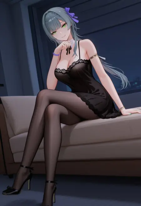 Thoth AG,夜之浪漫绽放,绿眼睛,灰发,长发,辫子,低马尾,发带,发饰,发带,紫色丝带,领子,白色领子,大胸,晨衣,黑色晨衣,臂环,手镯,青色指甲,连裤袜