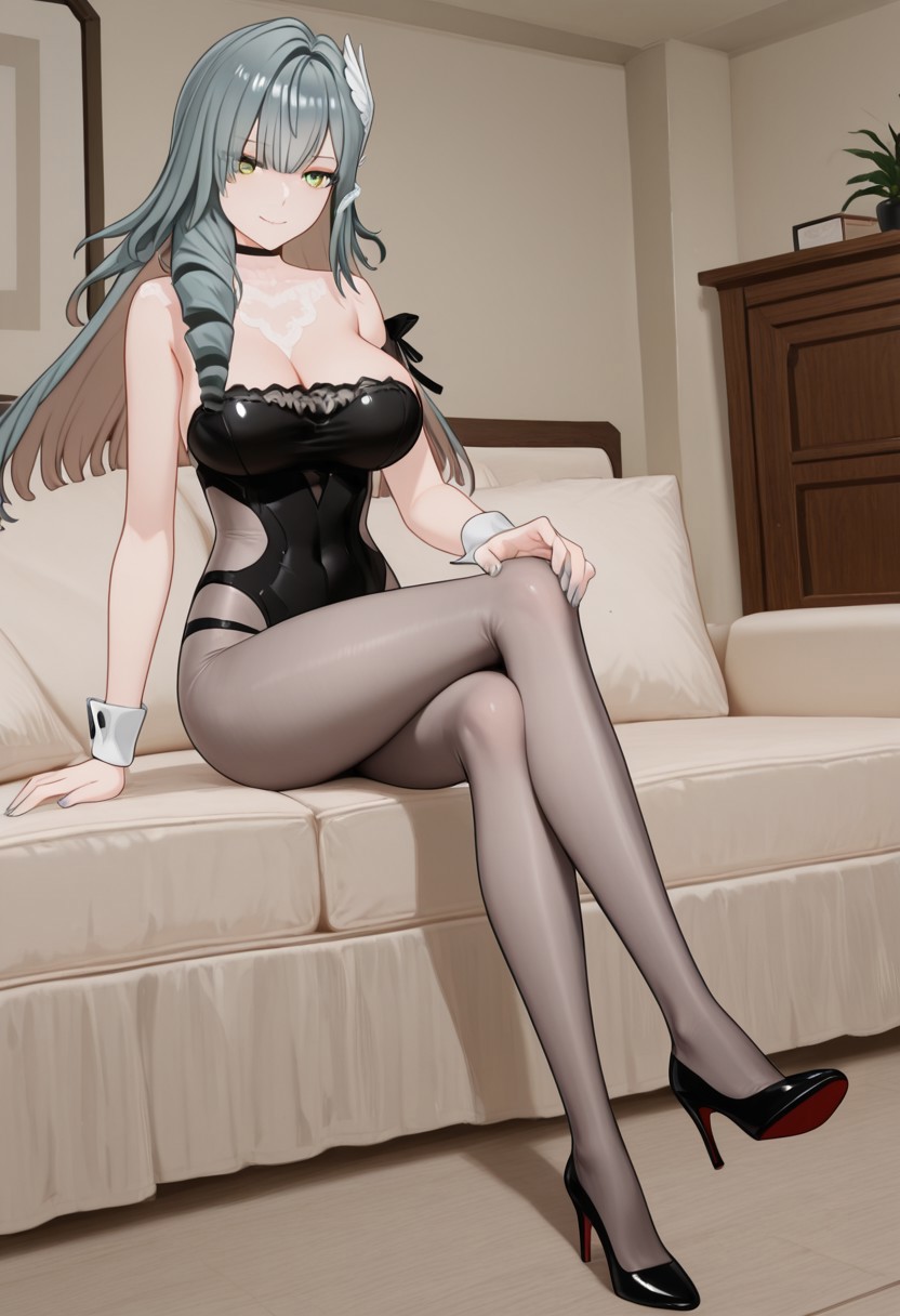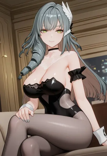 Thoth AG,暮诗绽放,绿眼睛,灰发,长发,钻孔发型,钻孔侧发辫,发饰,羽翼发饰,项圈,蕾丝边项圈,白色项圈,大胸,紧身衣,侧开衩,连体丝袜,臂环,腕环,灰指甲