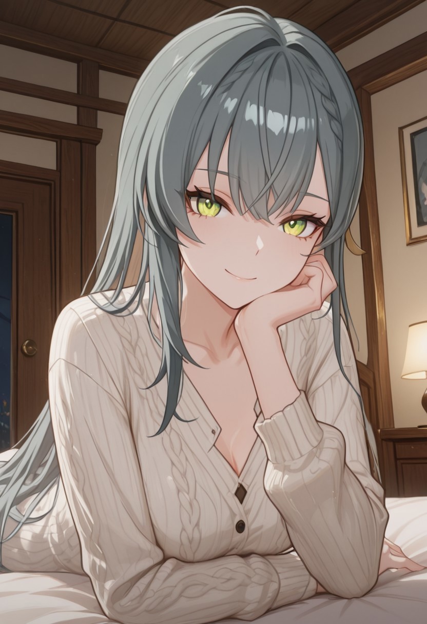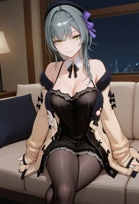 Thoth AG,夜之浪漫,绿眼睛,灰发,长发,辫子,低马尾,发带,发饰,发带,紫色丝带,帽子,贝雷帽,领子,白色领子,大胸,晨衣,黑色晨衣,开衫,敞开式开衫,袖子过腕,青色指甲,连裤袜