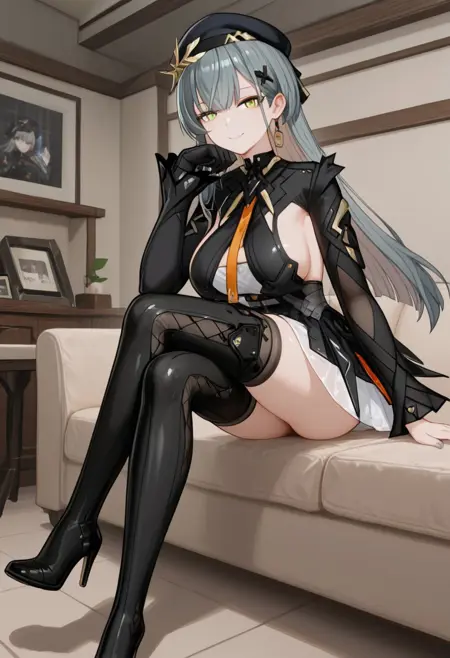 Thoth AG,灰鹭,绿眼睛,灰发,长发,发夹,单耳环,帽子,贝雷帽,大胸,短裙,白裙,迷你裙,侧乳,黑色开衫,长袖,宽袖,单只手套,灰指甲,黑色过膝袜,大腿靴